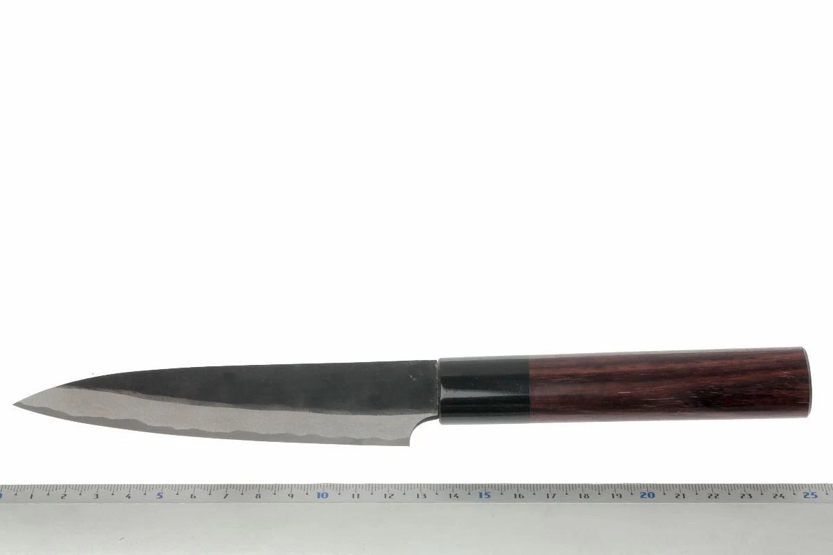 Ce couteau universel Eden Kanso Aogami est très polyvalent. Avec sa lame longue et fine, ce couteau est adapté pour de nombreuses coupes. La lame est légèrement courbée, et très pointue. Cela permet de pouvoir faire basculer le couteau sur la planche à découper lors de la coupe. La pointe est pratique pour les coupes de précision. Ce couteau s’avère particulièrement utile lorsque le couteau de chef est trop gros. Pour couper du fromage, du saucisson ou encore des herbes aromatiques par exemple.