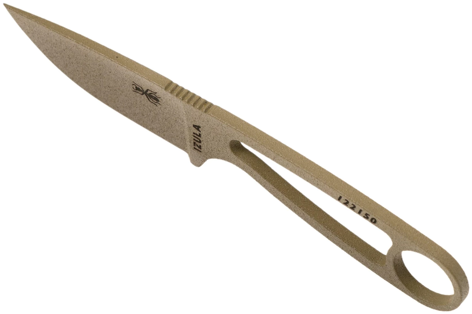 Le ESEE Izula Dark Earth with survivalkit tient son nom d’une fourmi agressive de la jungle péruvienne. Malgré ses dimensions limitées, ce couteau ne doit donc pas être sous-estimé. L’ESEE Izula est un couteau à lame fixe polyvalent. Il trouve facilement sa place dans un sac ou une poche ou est à porter comme couteau de cou. Malgré ses petites dimensions, il tient très bien en main. Le dos a une large ouverture où votre petit doigt se glisse pour une adhérence optimale. Bien sûr, vous pouvez lui ajouter une poignée en paracorde pour obtenir une meilleure prise en main. Et si vous préférez de ‘vraies’ poignées, ESEE Knives les livre également sous forme d’accessoire. Bien sûr, cela rend le couteau un peu plus épais.