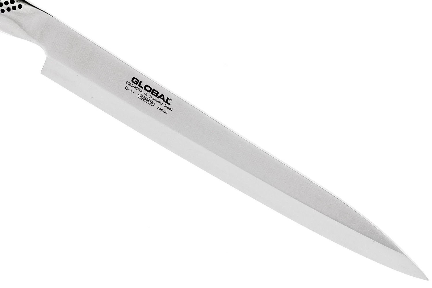 Le Global G11 est un couteau de chef multifonctionnel, qui ne convient qu’aux droitiers. C’est dû à la manière spéciale de découper, vous ne pouvez réaliser une découpe nette que si vous tenez le couteau de la main droite. La lame en acier Cromova 18 est livrée très tranchante.