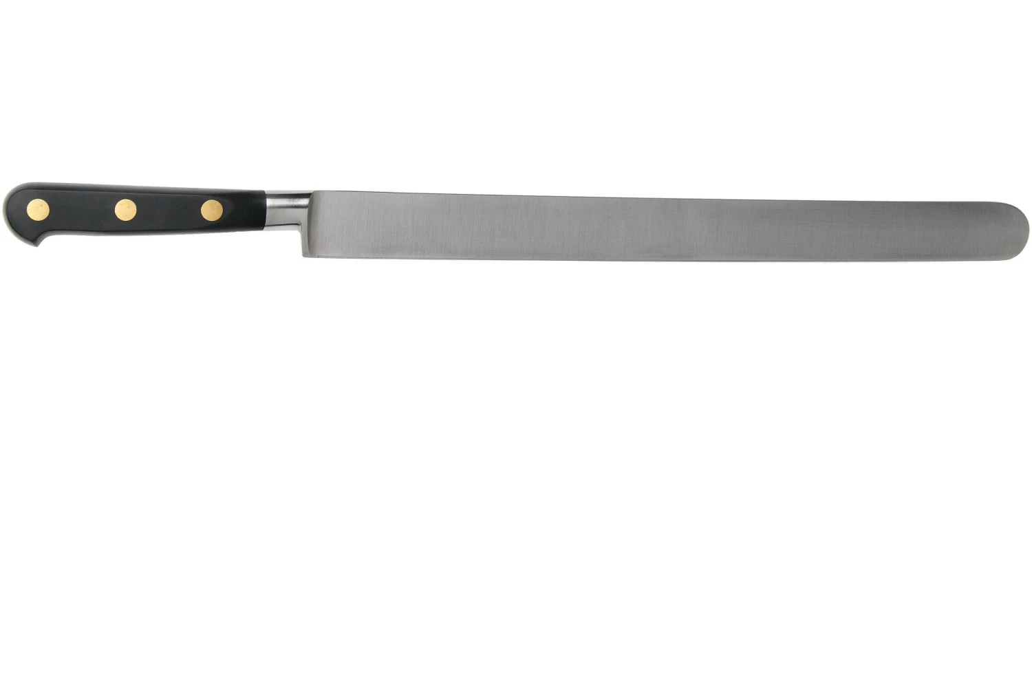 Le couteau à jambon Lion Sabatier Idéal ressemble à un couteau à filet ou à un couteau à désosser. La lame est longue et mince et assez souple. Pour cette raison, il est facile de bien diriger le couteau lors de la coupe. La longueur de la lame est comprise entre 20 et 35 cm. Une longue lame a l’avantage que vous pouvez couper une tranche entière en un seul mouvement. Un couteau à jambon peut également être utilisé pour du saumon, par exemple.