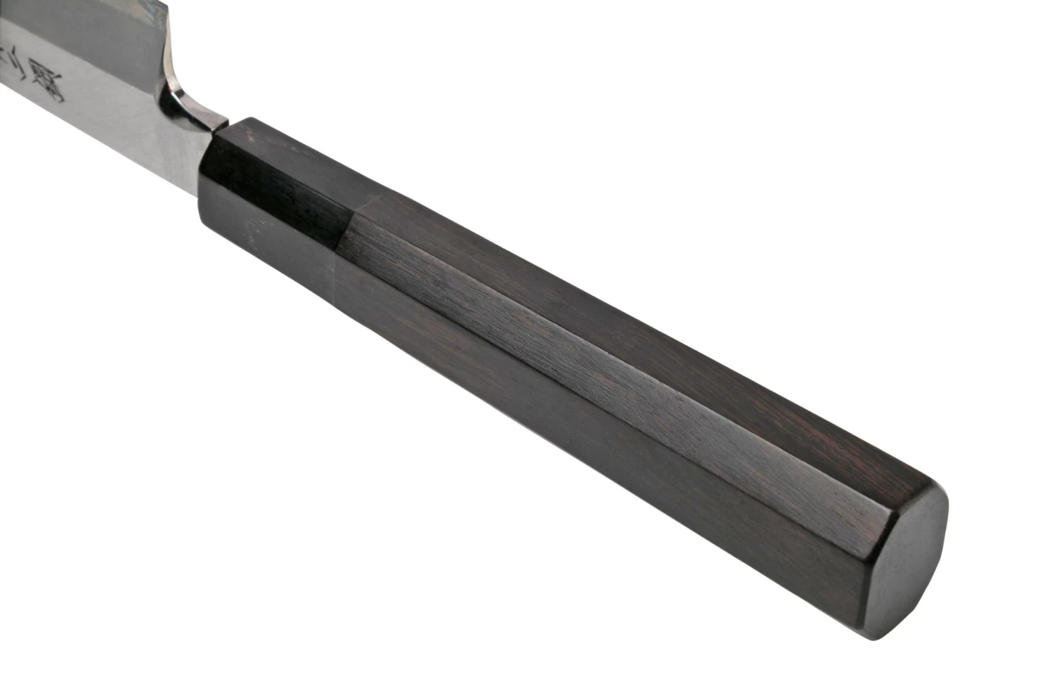 Le yanagiba Sakai Takayuki Blue 2 Steel Japanese Style 01204 est un couteau de cuisine aiguisé d’un seul côté, pour couper des tranches de viande, de poisson ou de légumes. La longueur de la lame permet d’effectuer de longs mouvements de coupe. De quoi préparer des tranches ultra fines de viande, poisson ou légumes. C’est idéal pour les sushis ou les sashimis !