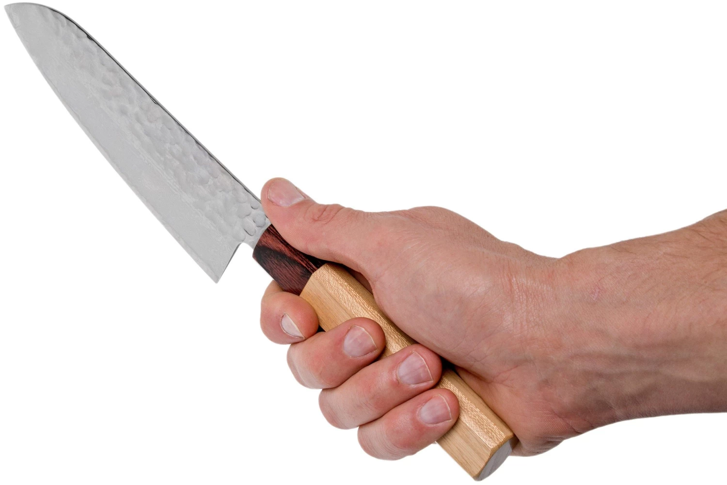 Ce santoku Sakai Takayuki de la gamme 33-layer VG-10 Damascue Hammered WA est la version japonaise d’un couteau de chef. Il vous permet d’effectuer quasiment toutes les tâches de coupe.