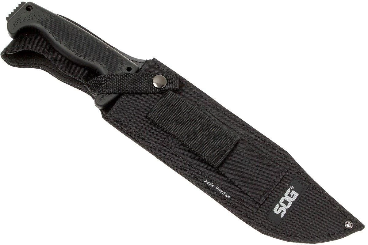 Le SOG Jungle Primitive F03TN-CP est un grand couteau fixe, à la limite entre un grand couteau et une petite machette. Comme vous pouvez imaginer, c’est un couteau très résistant, qui peut non seulement trancher mais aussi fendre du bois, faire levier et servir de marteau. Le manche en Kraton offre une bonne prise en main. La lame en acier 8Cr13MoV inoxydable est extrêmement tranchante et très facile à aiguiser. Elle est recouverte d’un revêtement sombre qui lui donne un look tactique. Le dos de la lame est en partie dentelé. Pratique pour les petits travaux de sciage. Le manche est pourvu d’un embout en acier. Il peut servir de marteau. Le couteau est livré avec un étui en nylon permettant un port très confortable. Ce couteau fixe polyvalent est votre meilleur atout lors de vos aventures de camping et de survie !